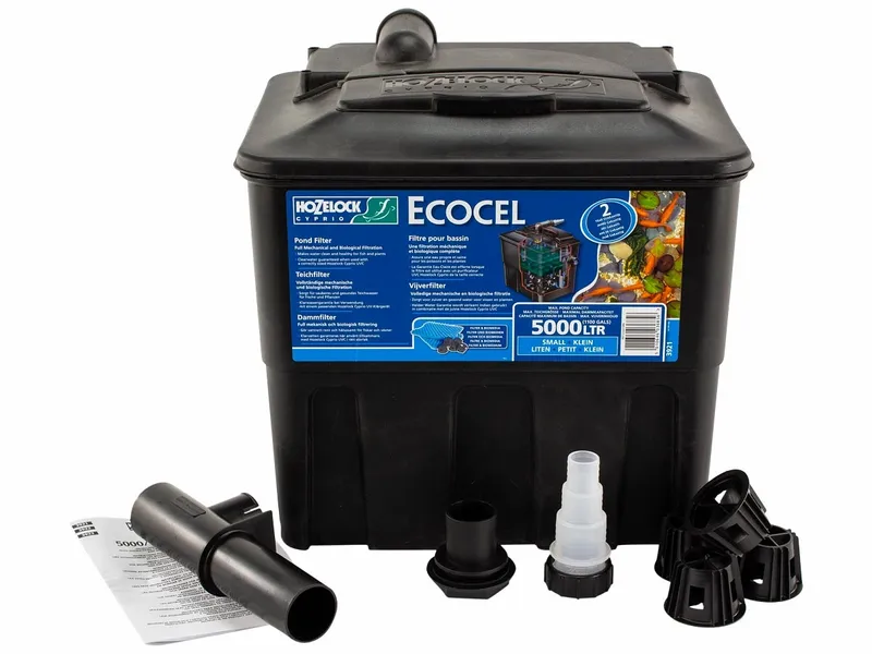 De Hozelock 5000 is een zeer eenvoudig te reinigen en te onderhouden vijverfilter. Het filter dient bovengronds geplaatst te worden aan de rand van de vijver of boven aan een beekloop of waterval. Het vijverfilter maakt gebruik van een tweevoudige filtratie en is geschikt voor vijvers met een maximale inhoud van 5000 liter. Deze maximale vijvergrootte is gebaseerd op vijvers zonder vissen, als u een lage of hogere visbezetting heeft wordt deze maximale inhoud verlaagd tot 3750 of 2500 liter. Bij dit product geeft Hozelock, mits juist gebruikt, een ‘helder water garantie’ af.