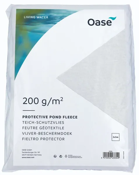 Dit vijverbeschermdoek is gemaakt van PET-synthetische vezels en heeft een gewicht van 200 g/m². Het doek is wit en heeft een duurzaam weefsel dat het bovenliggende vijverfolie beschermt tegen beschadiging door bijvoorbeeld stenen en wortelgroei. Het 2 meter brede en 5 meter lange doek wordt gebruikt als aanvulling op het zandbed onder het vijverfolie bij het aanleggen van een vijver. Het folie is voorverpakt en kun je makkelijk precies op maat maken met een schaar.