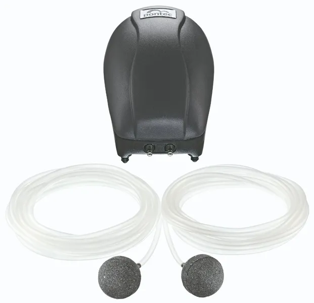 Met de Pontec PondoAir 200 luchtpompset haal je eenvoudig extra zuurstof in huis voor je vijverleven! Deze set is perfect voor vijvers tot 4000 liter en biedt een zuurstofcapaciteit van 200 liter per uur. De set bestaat uit een luchtpomp, 2 x 5 meter lange luchtslangen, 2 uitstroomstenen en 2 reservemembranen. Bovendien heeft de PondoAir 200 een veiligheidsklasse IP 44, waardoor hij bestand is tegen spatwater, zodat je hem zowel binnen als buiten kunt gebruiken. Met een laag geluidsniveau en een vermogen van 4 watt, is de Pontec PondoAir 200 een betrouwbare keuze om je vijver zuurstofrijk te houden!