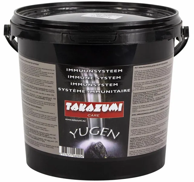 Het toedienen van Yugen resulteert zowel bij de opgroeiende als bij de volwassen koi in een zeer korte tijd in een compleet ontwikkeld en superieur functionerend immuunsysteem. Wij adviseren Takazumi Yugen 4x per jaar (voor 5 dagen) te voeren in plaats van het normale voer. Hierbij dient u rekening te houden met tussenpozen van minimaal 2 maanden. Aan te raden is om in ieder geval vlak voor én vlak na de winterperiode te voeren met Yugen.