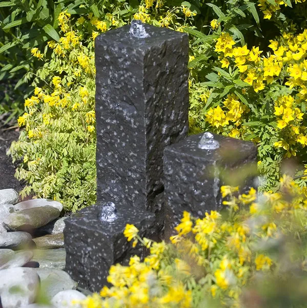 Dit ornament voor de tuin is een drie in één waterelement. Uit iedere zuil stroomt namelijk water. Door de driewegkraan vindt de toestroom naar de zuilen plaats. Ze verschillen in hoogte wat het geheel een extra leuk effect geeft.