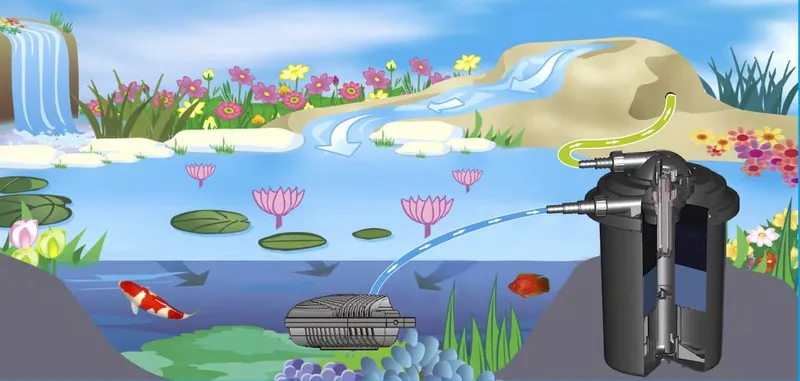 Het grote voordeel van een drukfilter is dat je hem makkelijker uit het zicht plaatst. Het filter graaf je grotendeels in bij de vijver en met behulp van vijverslangen koppel je hem met je vijverpomp. Doordat dit drukfilter los geleverd wordt, kies je hierbij zelf de gewenste capaciteit van de vijverpomp. Via het andere uiteinde laat je het vijverwater terugstromen in de vijver of voer je het op naar een waterval of beekloop.