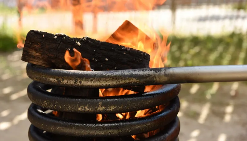 - Steek het vuur in de korf aan, deze zit in de spiraal
